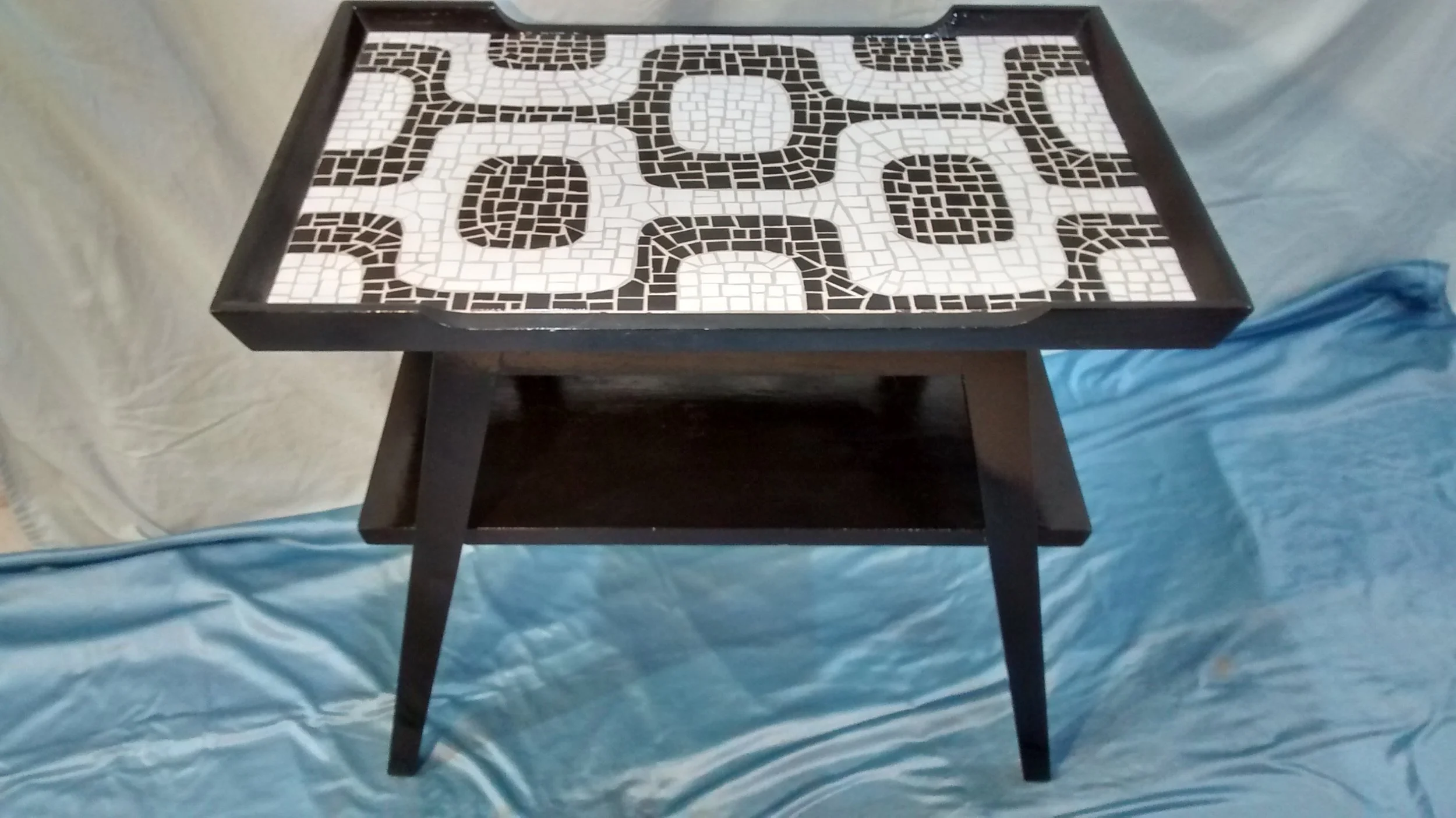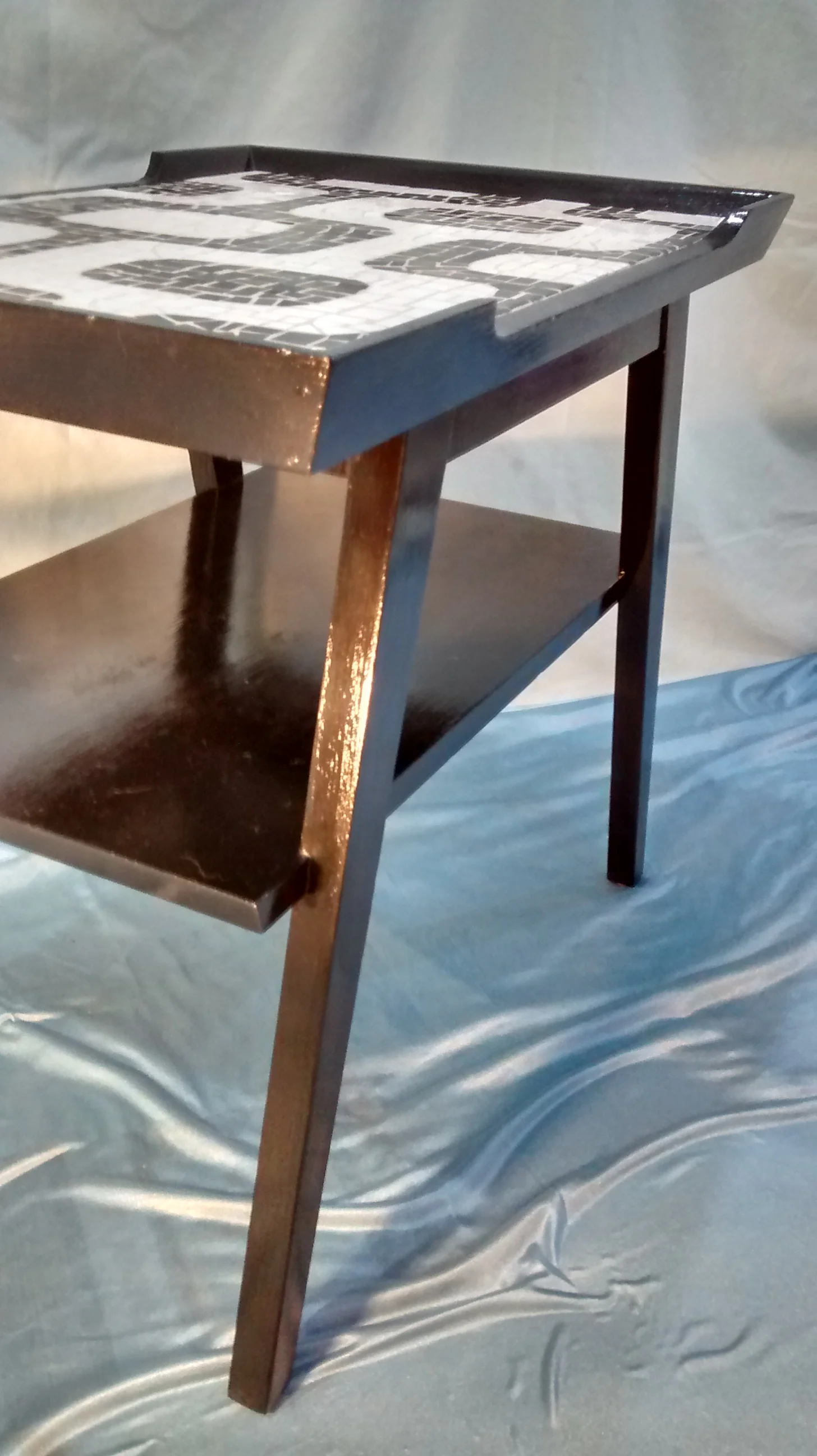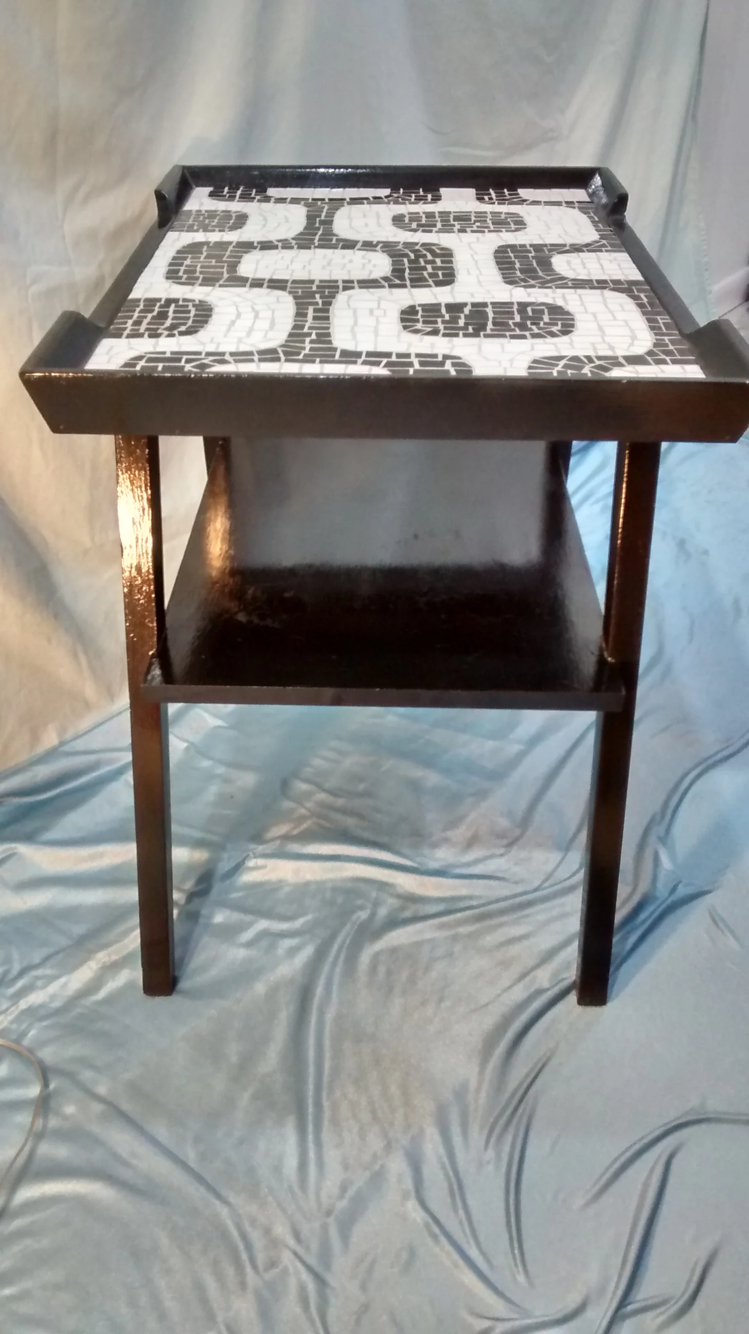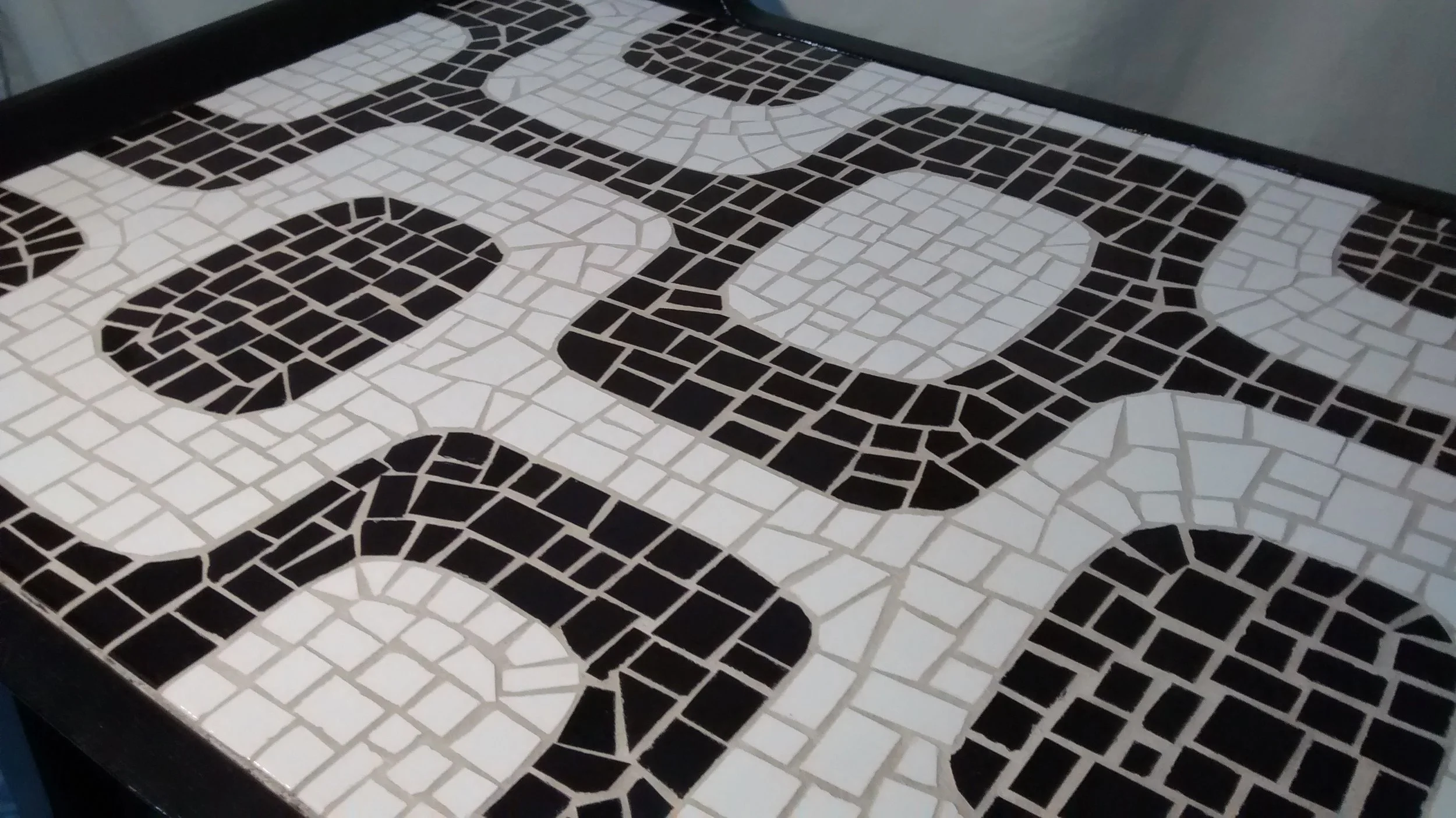 This is one of my all-time favorite projects. I use it in my basement guest room/library, which has something of a black and white color scheme. I found the table in an alley in my Glover Park neighborhood of D.C. It was in good shape, though the original finish was a boring brown. I had painted everything but the top a glossy black but wasn’t sure what to do with the top. On a visit to Rio de Janeiro, Brazil, came upon the inspiration for an upcycling project—specifically, the design of the broad sidewalk that runs for a couple of miles along the beaches of Leblon and Ipanema. The mosaic design that I created on the top is an exact small-scale copy of that sidewalk, taken from photographs I made during our visit there. I think most of the tile was left over from another project.