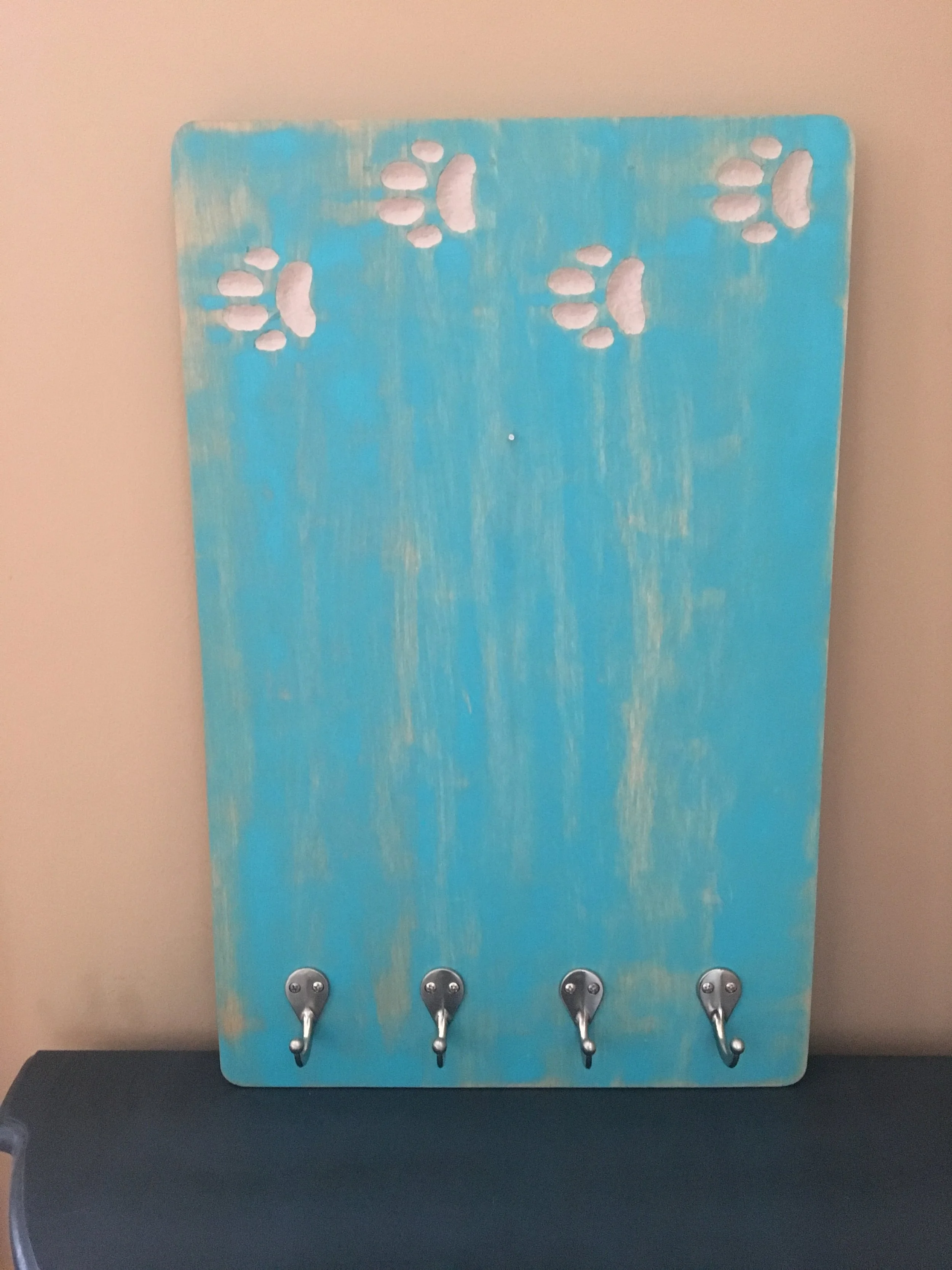 I found what looked like part of a reader’s/writer’s desk in an alley in the Cleveland Park neighborhood of D.C. I disassembled it and used the main piece to make a custom leash hanger at the request of a dog-loving friend. She mentioned that turquoise and gray were common colors in her house, so I chose a turquoise spray paint but partly rubbed and sanded it off to create a more distressed look. I carved the pawprints to match the actual pawprint of her dog. I hand painted the pawprints and the frame gray.